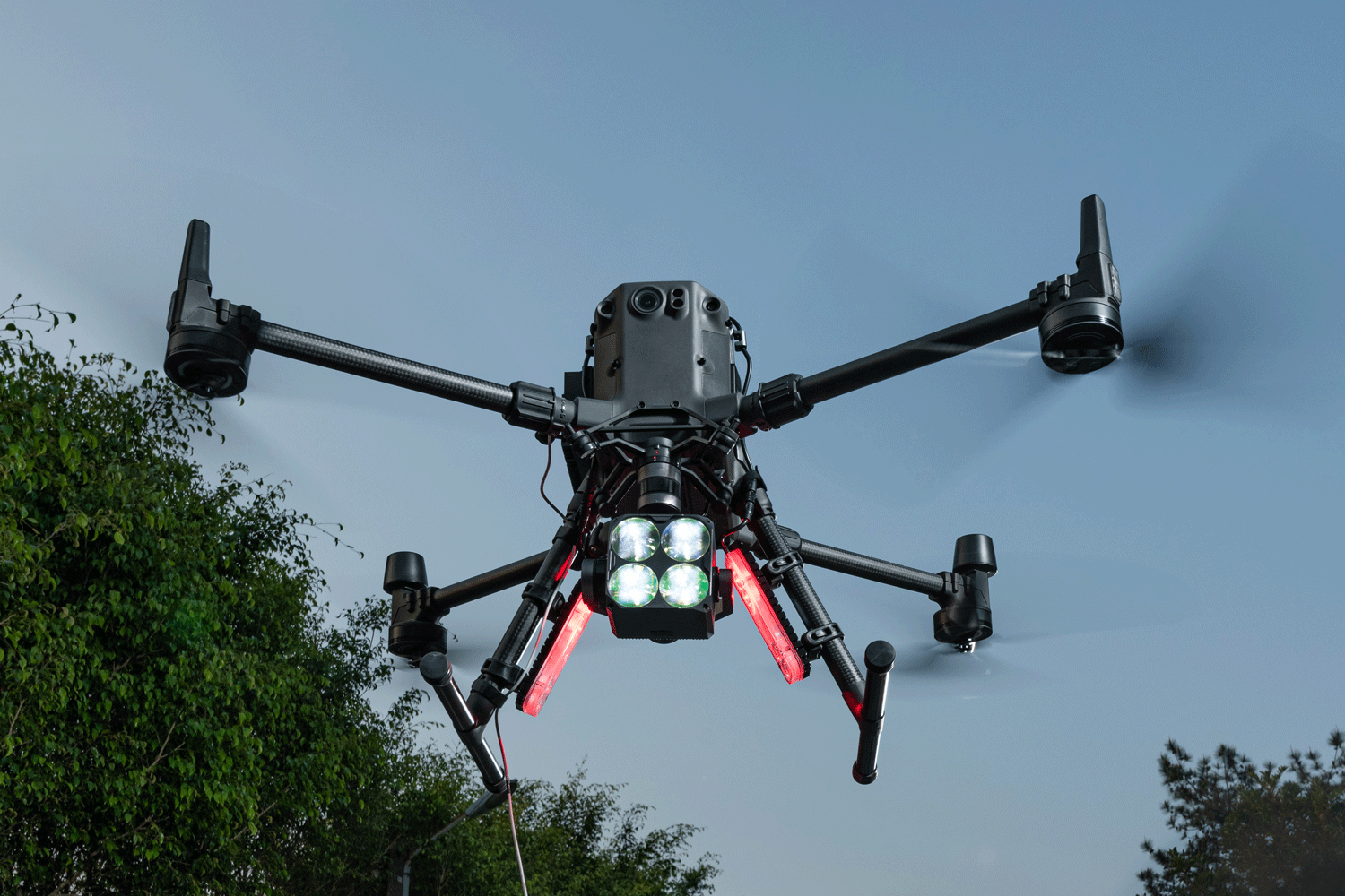 成至 GL60 Plus 云臺燈,采用 4 組光學成像組件,每組由 4 片透鏡組合而成,發射出僅 15 度角的銳利光柱,顏色一致,亮度均勻,在 120w 時,100m 的光斑中心照度值達 24lux;在 150m 的照射高度下,有效照射面積達 1225 平方米,將無人機夜間作業的空中照射效果,提升至新的高度。整體采用輕量設計,僅重 750 克,額定功率達 120W ,通過 DJI SkyPort V2.0 接口,兼容大疆經緯 M300 RTK 等系列無人機,可滿足夜晚巡查、警告驅離、方位指示、電力巡線、搜索救援等夜間作業需求。